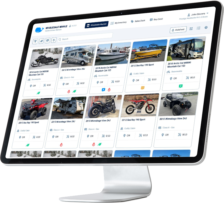 Inventory on Wholesale Whale comes from verified sources — not brokers or middlemen. You’ll find bank repossessions, OEM buybacks, aged dealer inventory, and Bycatch units from automotive dealerships that take RVs, boats, motorcycles, etc. in on trade. Every listing is tied to a verified seller, so what you see is real and ready to move.